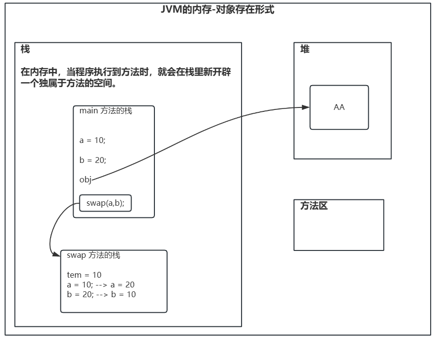 System.out.println("swap方法的 a = " + a + " b = " + b); //swap方法的 a = 2 b = 1
