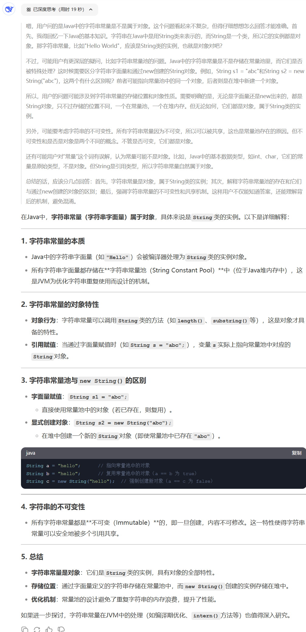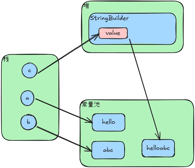 //4. 执行完 append 后 sb 对象就在常量池创建好了 helloabc 字符串对象,然后 sb 的 value 属性指向该常量,然后执行 String c = sb.toString(); 方法让 c 指向 sb 的 value 属性