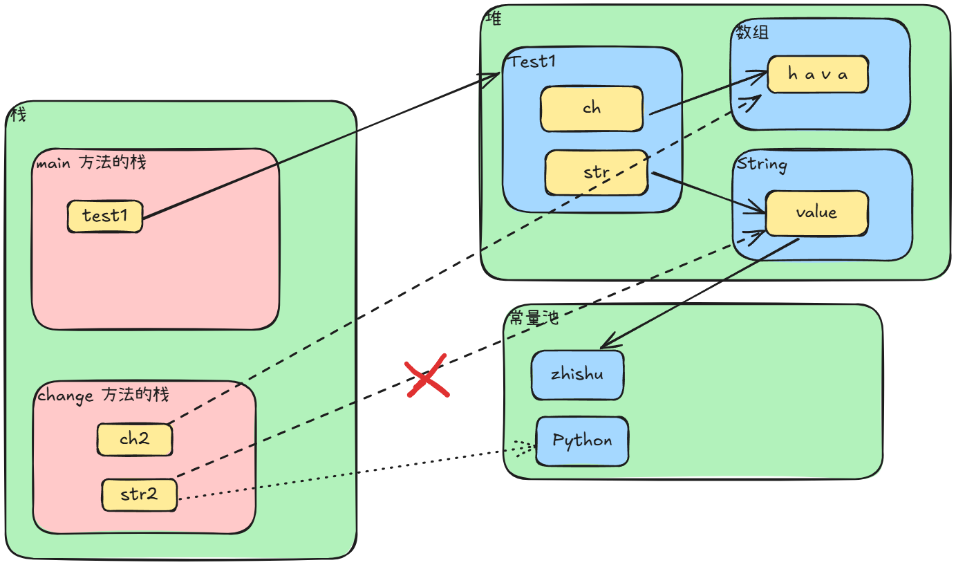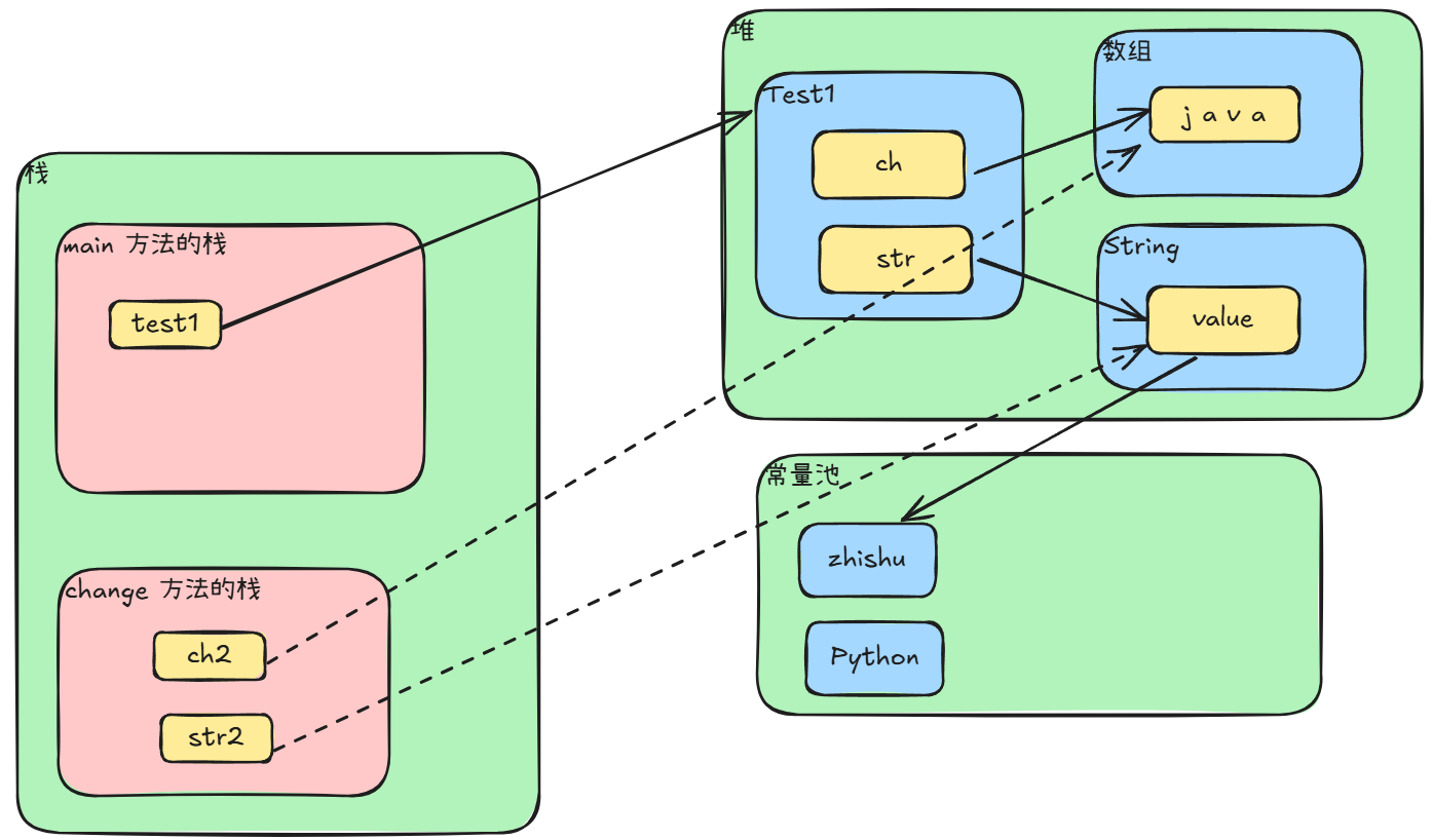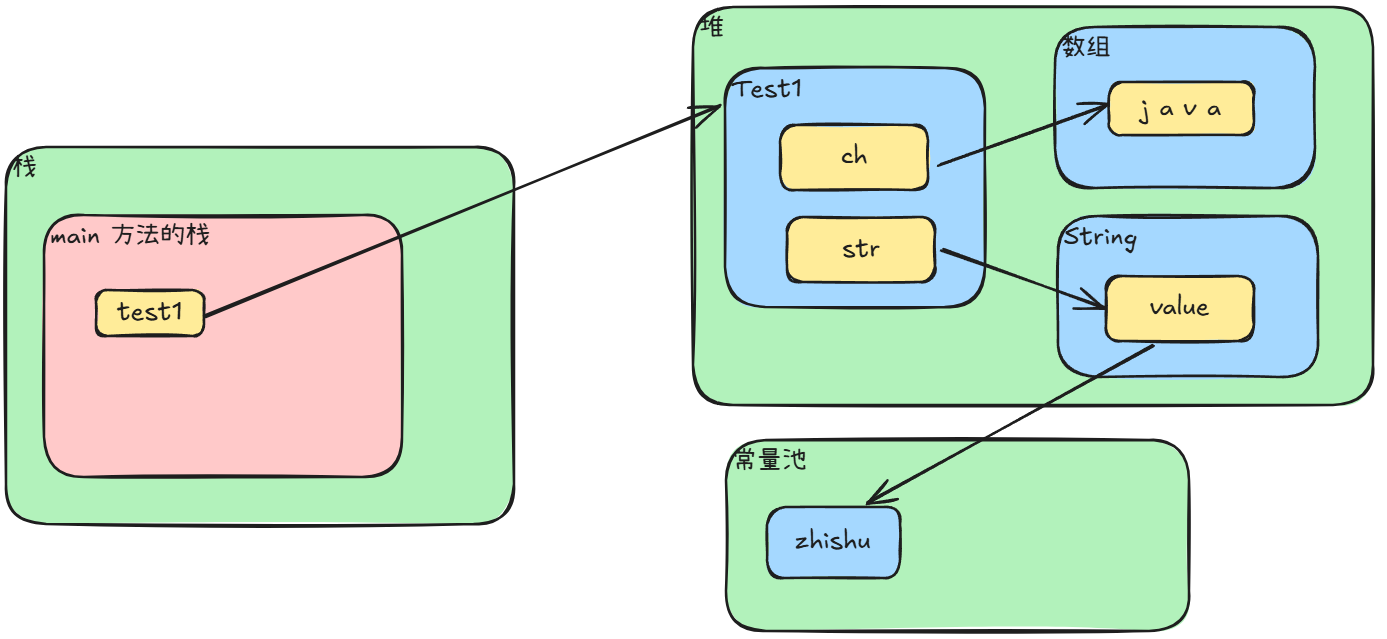 先画出执行完 Test1 test1 = new Test1(); 但还没执行 test1.change(test1.str, test1.ch); 的内存布局图