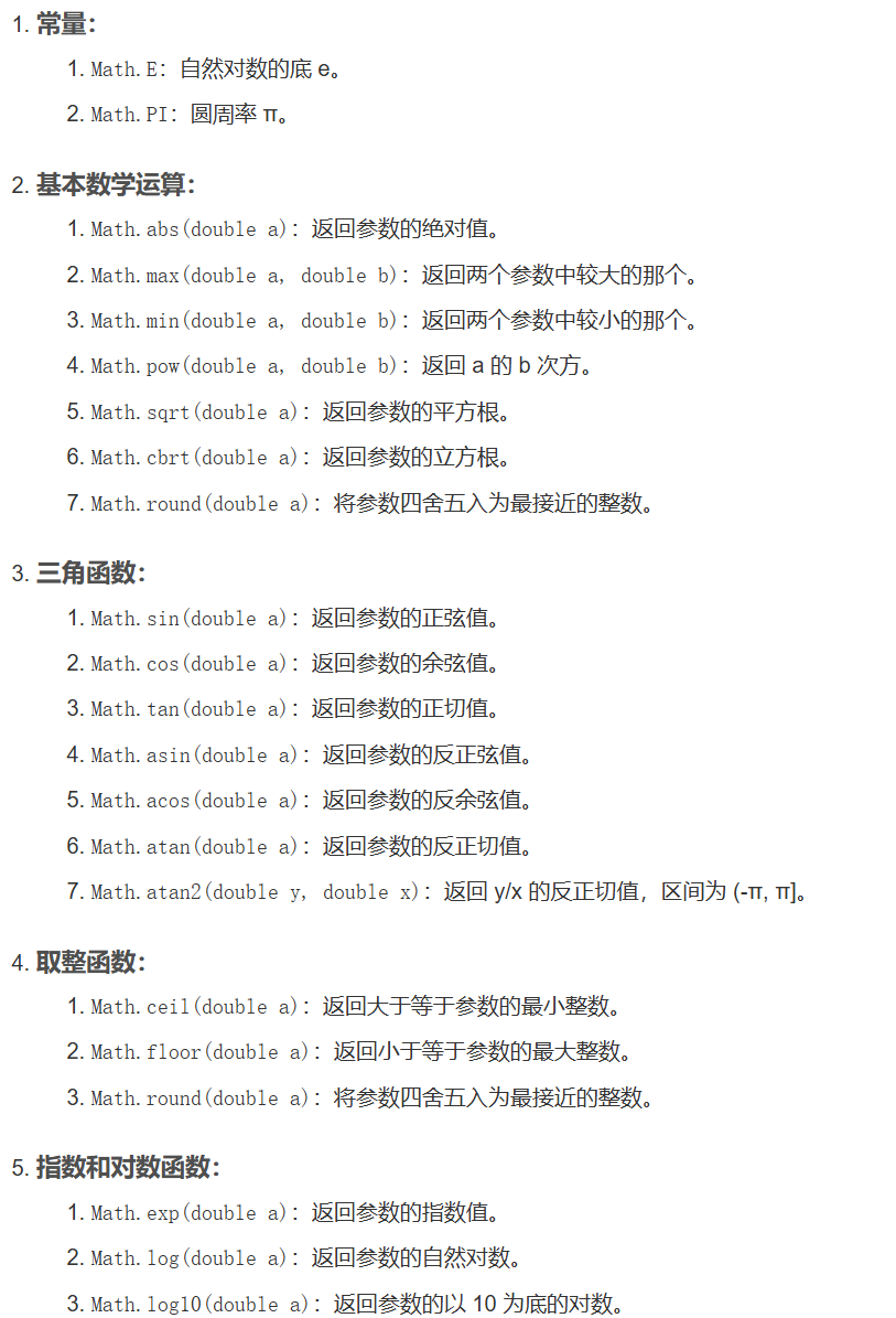 Math 类包含用于执行基本数学运算的方法,如初等指数、对数、平方根和三角函数
